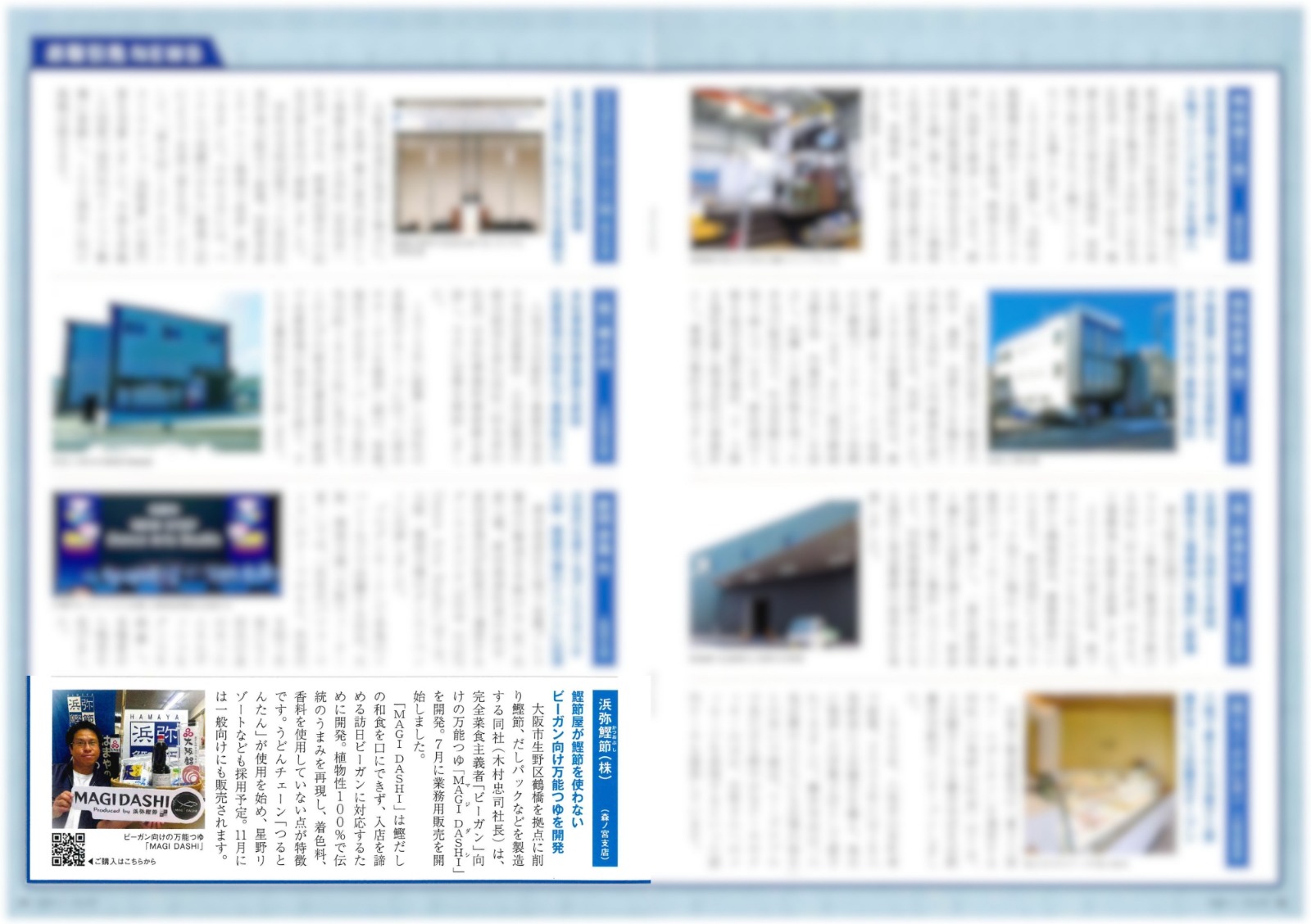 機関誌の「お取引先 NEWS」コーナーに、「鰹節屋が鰹節を使わない ビーガン向け万能つゆを開発」という見出しで、ヴィーガン対応万能つゆ『MAGI DASHI-マジダシ-』の開発秘話が掲載されています。