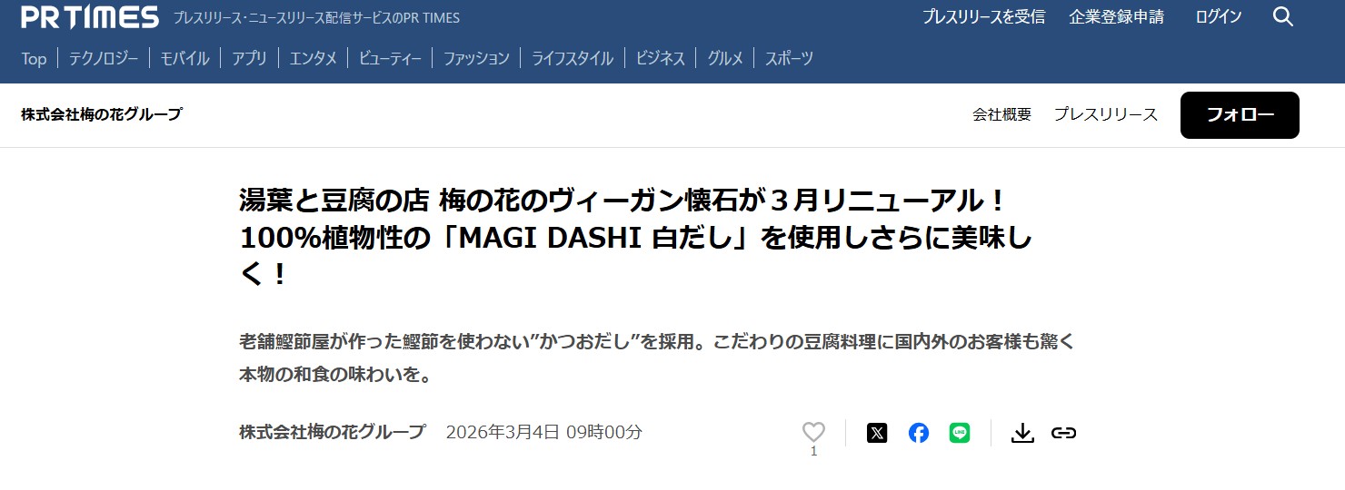 先日の「湯葉と豆腐の店 梅の花」様での採用に続き、日本最高峰の帝国ホテル東京という舞台でも弊社の出汁が活用されることは、名店からトップクラスのホテルまで、食の多様化を牽引するプロの現場で弊社の品質が信頼されている証と考えます。