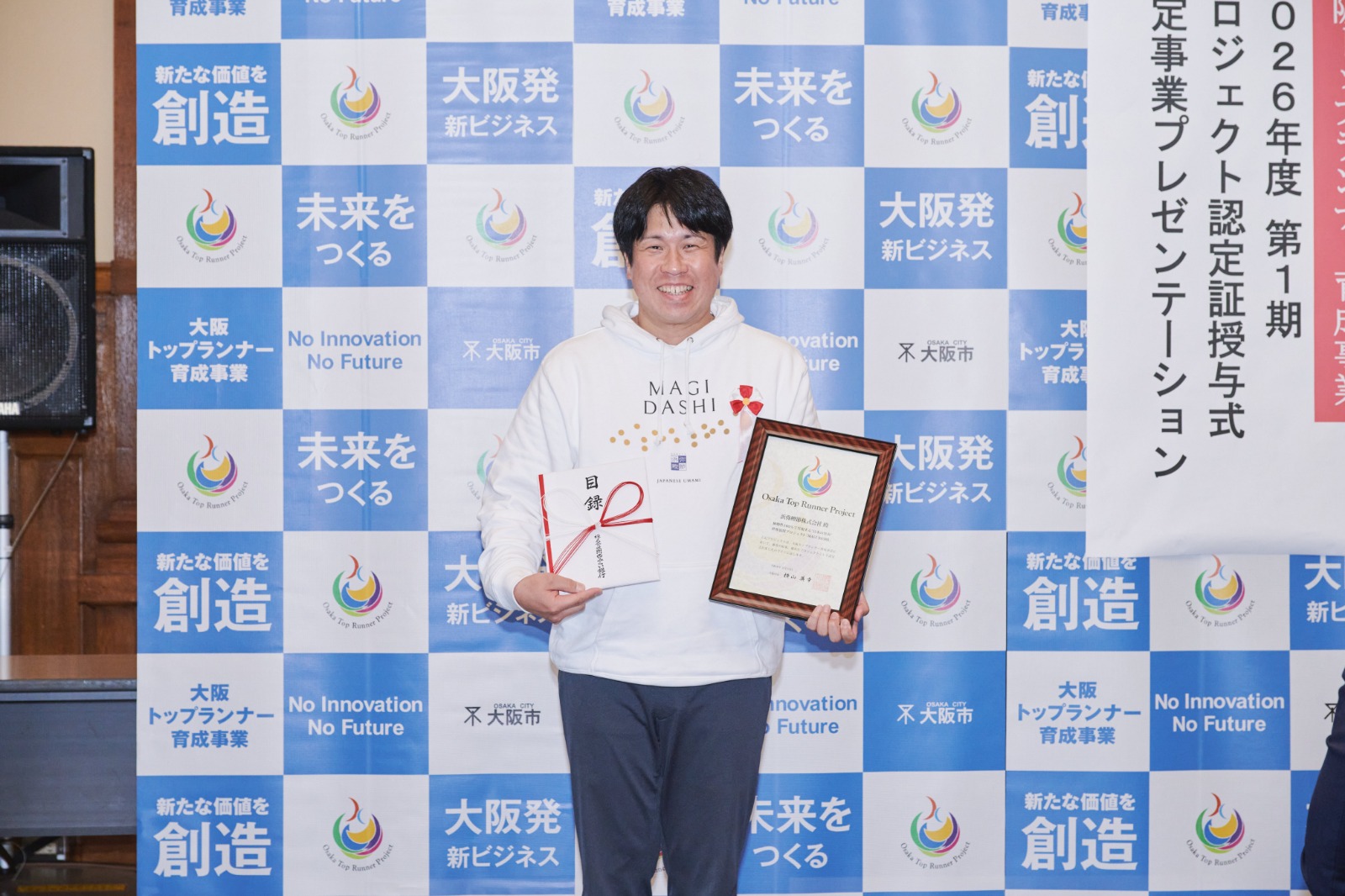 授与式では、多くの来場者が見守る中、大阪市より認定証を拝受いたしました。その後行われたプレゼンテーション会では、弊社代表取締役 木村忠司が登壇し、認定プロジェクトである「植物性100%で実現する“日本の旨み”世界展開プロジェクト『MAGI DASHI』」について発表いたしました。